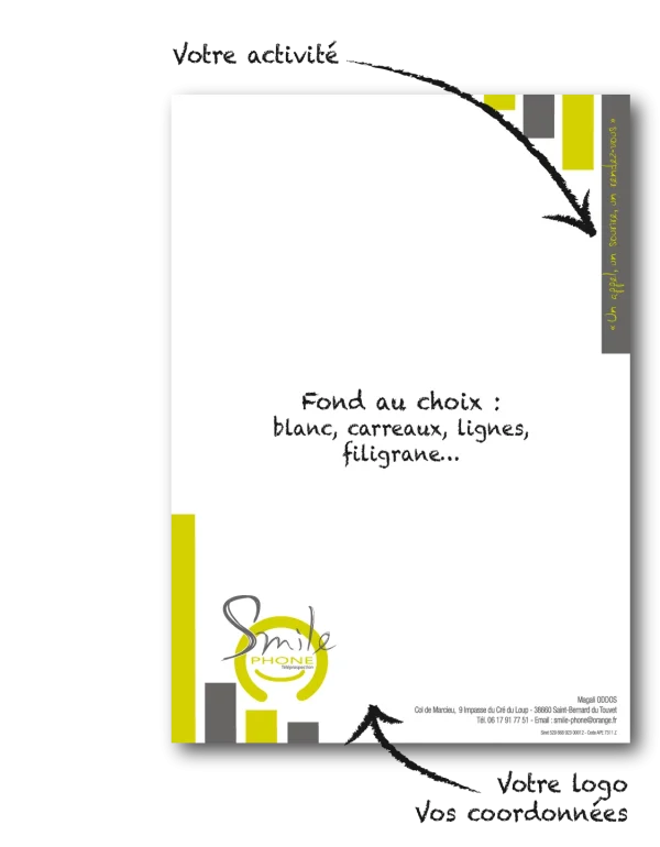 Ce bloc note publicitaire A4 (21 x 29,7 cm) au graphisme moderne est disponible dans toutes les couleurs selon votre propre charte, Vous pouvez l’ajouter au devis et/ou le commander, nous adapterons les couleurs à votre charte graphique ou votre logo !