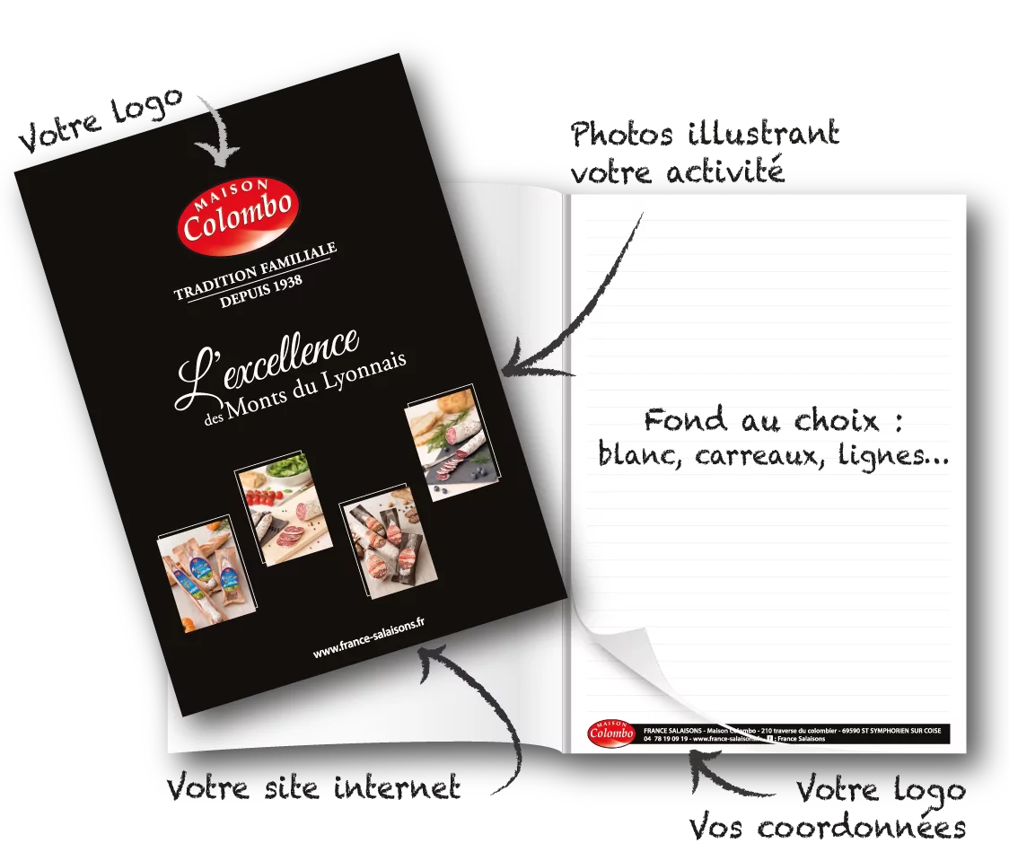Ce bloc avec couverture personnalisée A4 (21 x 29,7 cm) esthétique avec ses photos est disponible dans toutes les couleurs selon votre propre charte, Vous pouvez l’ajouter au devis et/ou le commander, nous adapterons les couleurs à votre charte graphique ou votre logo !