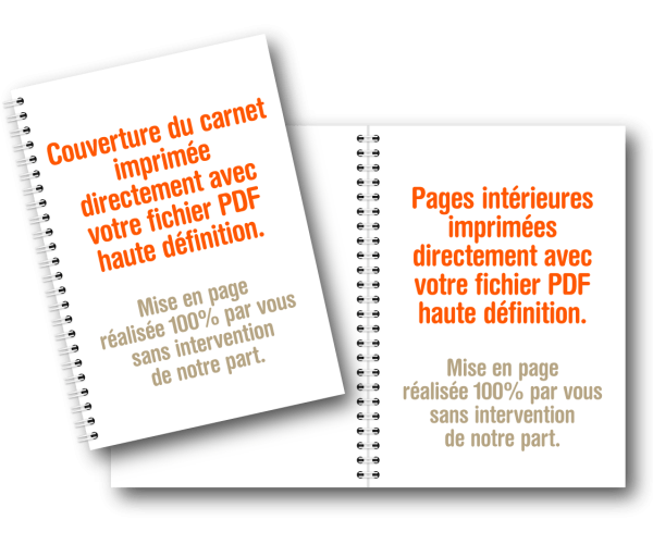 Ce cahier personnalisé A4 (21 x 29,7 cm) mis en page par vos soins est imprimé directement d’après vos fichiers PDF haute définition (couvertures et pages intérieures), Vous pouvez l’ajouter au devis et/ou le commander !