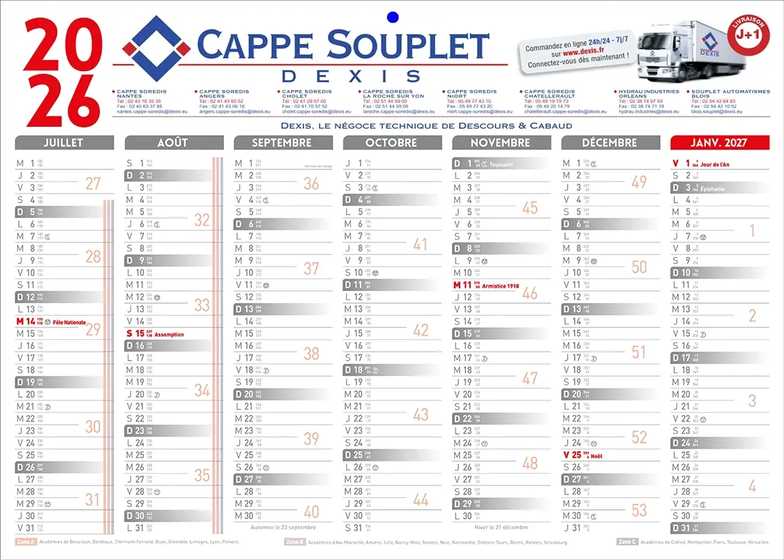 Calendrier format A4 (29,7 x 21 cm) classique gris et rouge 2 faces : au recto 7 mois de décembre 2025 à juin 2026 et au verso 7 mois de juillet 2026 à janvier 2027. Vous pouvez l’ajouter au devis et/ou le commander, nous intégrerons votre marquage publicitaire et votre logo suivant votre charte graphique.