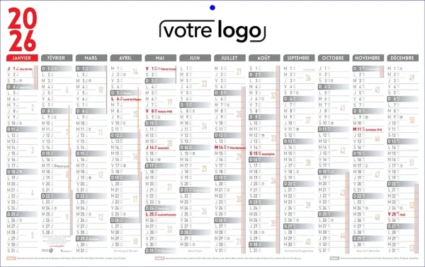 Calendrier format maxi-bancaire (66 x 39 cm) classique gris et rouge 1 face : de janvier 2026 à décembre 2026. Vous pouvez l’ajouter au devis et/ou le commander, nous intégrerons votre logo, vos photos et votre message publicitaire suivant votre charte graphique.