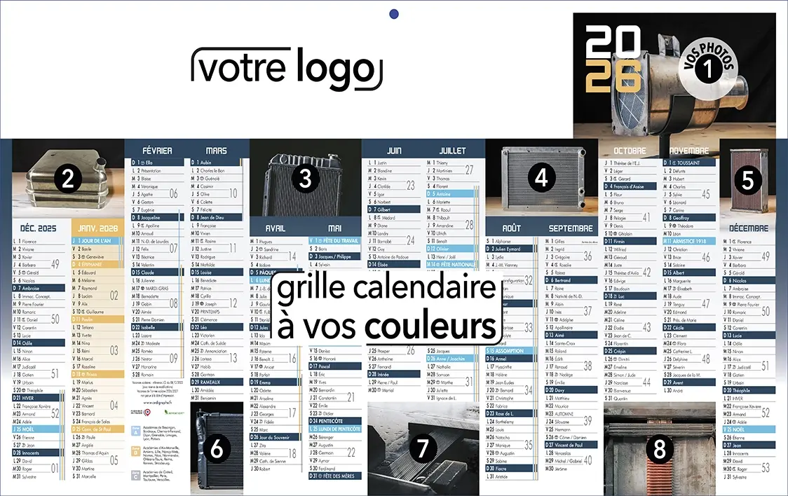 - Personnalisation totale du calendrier : grille calendaire à vos couleurs avec vos photos et vos logos