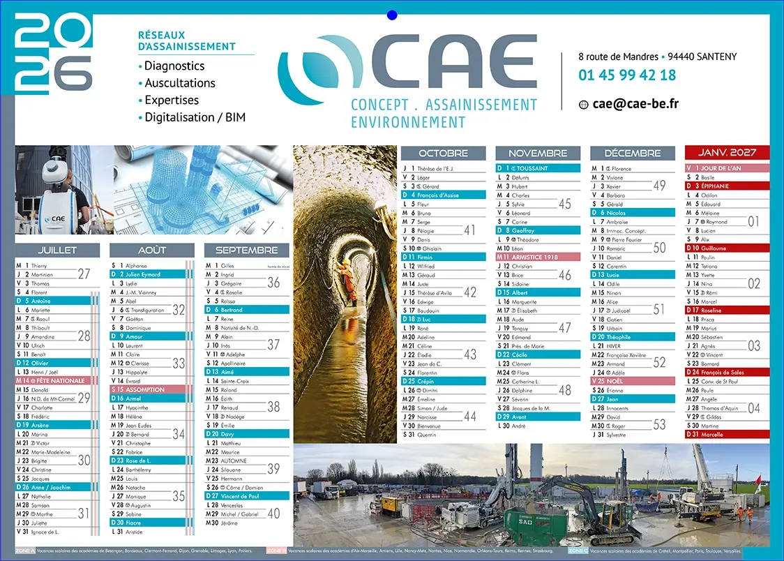 Calendrier publicitaire cartonné totalement personnalisable A4 format (29,7 x 21 cm) 2 faces : au recto 7 mois de décembre 2025 à juin 2026 et au verso 7 mois de juillet 2026 à janvier 2027. Vous pouvez l’ajouter au devis et/ou le commander, nous personnaliserons la grille calendaire à vos couleurs en intégrant vos logos et photos.
