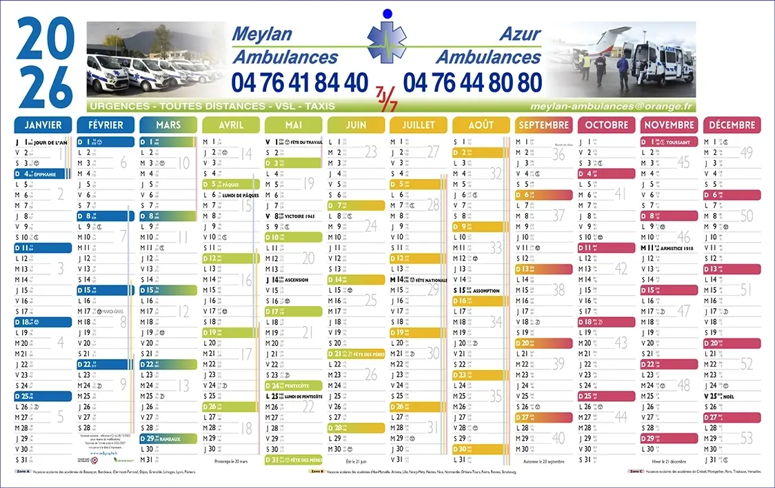 Calendrier professionnel entièrement personnalisable format maxi-bancaire (66 x 39 cm) 1 face : de janvier 2026 à décembre 2026. Nous harmoniserons les couleurs de la grille calendaire suivant votre charte graphique, puis intégrerons votre logo, vos photos et votre message publicitaire !