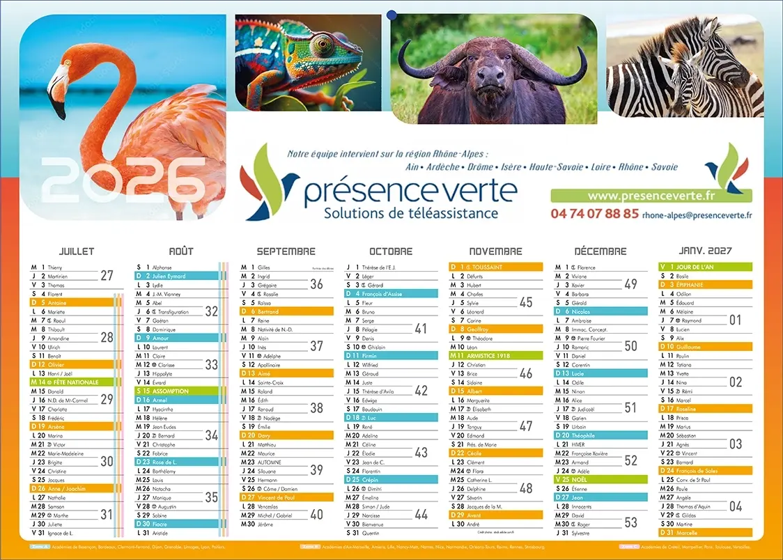 Calendrier format bancaire (53 x 39 cm) Animalia 2 faces : au recto 7 mois de décembre 2025 à juin 2026 et au verso 7 mois de juillet 2026 à janvier 2027. Vous pouvez l’ajouter au devis et/ou le commander, nous intégrerons votre logo, vos photos et votre message publicitaire suivant votre charte graphique !