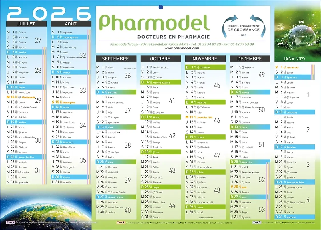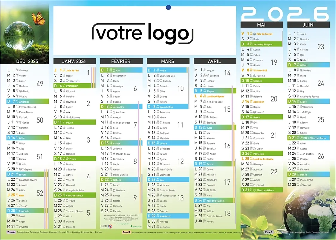 Calendrier format bancaire (53 x 39 cm) Éco Sphère 2 faces : au recto 7 mois de décembre 2025 à juin 2026 et au verso 7 mois de juillet 2026 à janvier 2027. Vous pouvez l’ajouter au devis et/ou le commander, nous intégrerons votre logo, vos photos et votre message publicitaire suivant votre charte graphique !