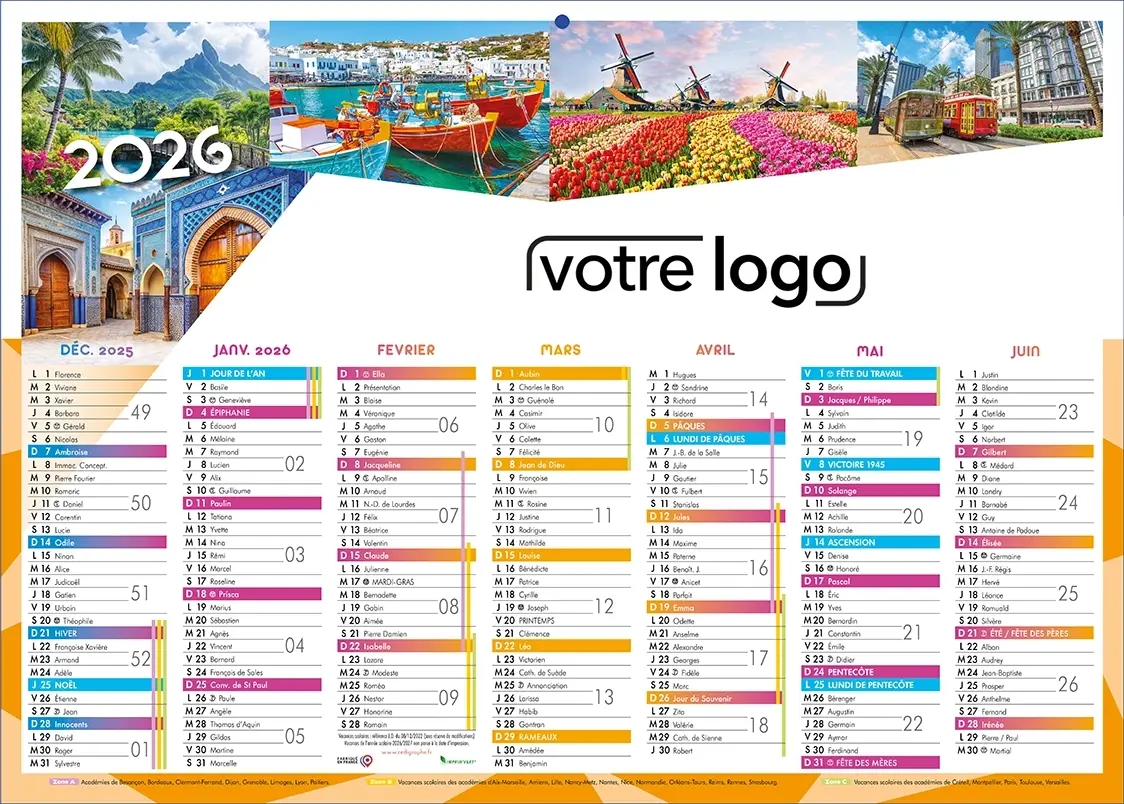 Calendrier format bancaire (53 x 39 cm) Voyages 2 faces : au recto 7 mois de décembre 2025 à juin 2026 et au verso 7 mois de juillet 2026 à janvier 2027. Vous pouvez l’ajouter au devis et/ou le commander, nous intégrerons votre logo, vos photos et votre message publicitaire suivant votre charte graphique !