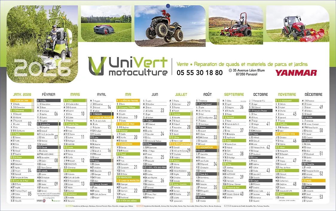 Calendriers 100% personnalisés maxi-bancaire (66 x 39 cm) 1 face : de janvier 2026 à décembre 2026. Nous harmoniserons les couleurs de la grille calendaire suivant votre charte graphique, puis intégrerons votre logo, vos photos et votre message publicitaire !
