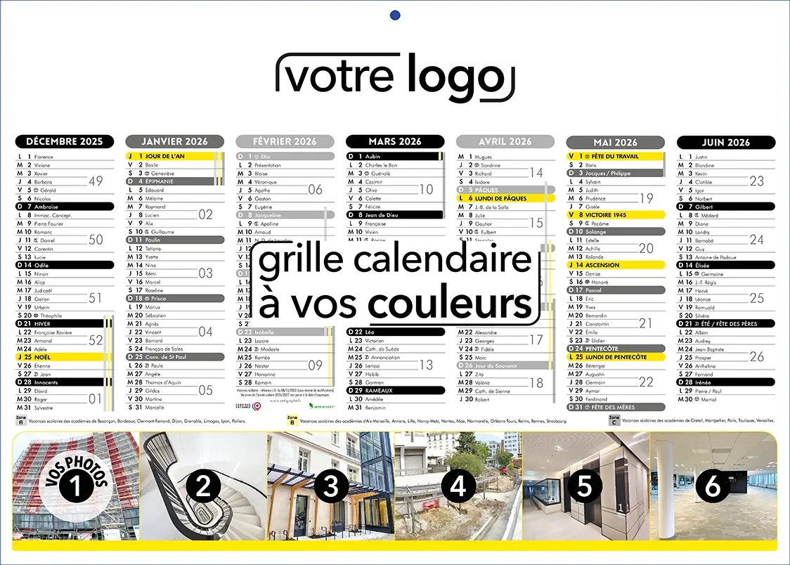 - Personnalisation totale du calendrier : grille calendaire à vos couleurs avec vos photos et vos logos
