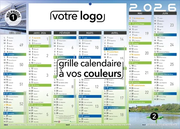 Calendriers 100% personnalisés format bancaire (53 x 39 cm) 2 faces : au recto 7 mois de décembre 2025 à juin 2026 et au verso 7 mois de juillet 2026 à janvier 2027. Nous harmoniserons les couleurs de la grille calendaire suivant votre charte graphique, puis intégrerons votre logo, vos photos et votre message publicitaire !