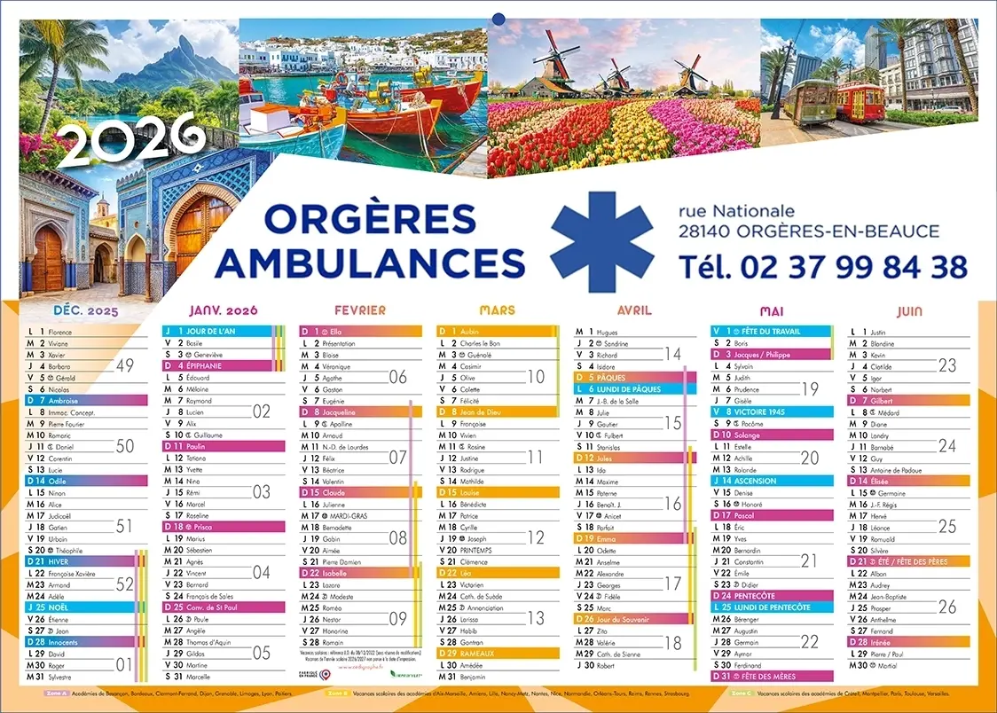 Calendrier ambulanciers format A4 (29,7 x 21 cm) Voyages 2 faces : au recto 7 mois de décembre 2025 à juin 2026 et au verso 7 mois de juillet 2026 à janvier 2027. Vous pouvez l’ajouter au devis et/ou le commander, nous intégrerons votre marquage personnalisé et votre logo suivant votre charte graphique.