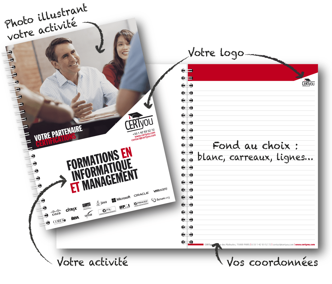 Ce carnet personnalisé A5 (14,8 x 21 cm) agrémenté d’une grande photo est disponible dans toutes les couleurs selon votre propre charte, Vous pouvez l’ajouter au devis et/ou le commander, nous adapterons les couleurs à votre charte graphique ou votre logo !