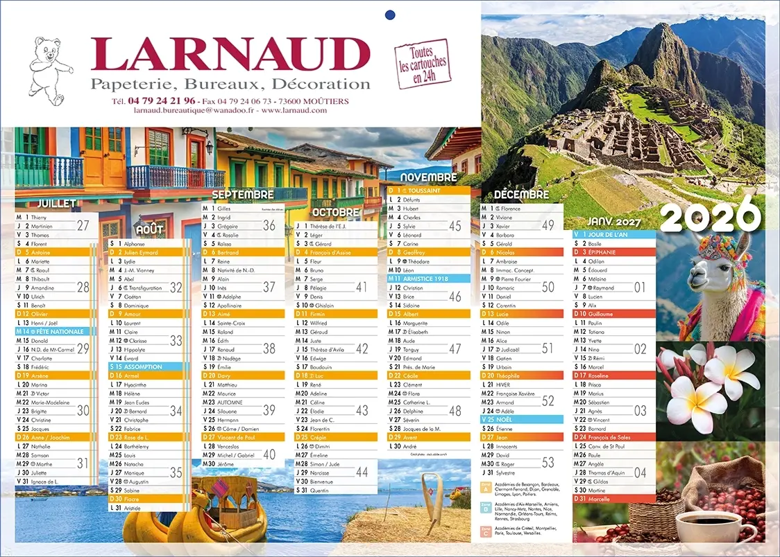 Calendrier format bancaire (53 x 39 cm) Couleurs du Monde 2 faces : au recto 7 mois de décembre 2025 à juin 2026 et au verso 7 mois de juillet 2026 à janvier 2027. Vous pouvez l’ajouter au devis et/ou le commander, nous intégrerons votre logo, vos photos et votre message publicitaire suivant votre charte graphique !