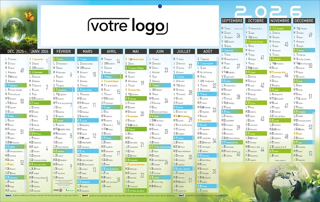 Calendrier format maxi-bancaire (66 x 39 cm) Éco Sphère 1 face : de décembre 2025 à décembre 2026. Vous pouvez l’ajouter au devis et/ou le commander, nous intégrerons votre logo, vos photos et votre message cartonné suivant votre charte graphique.